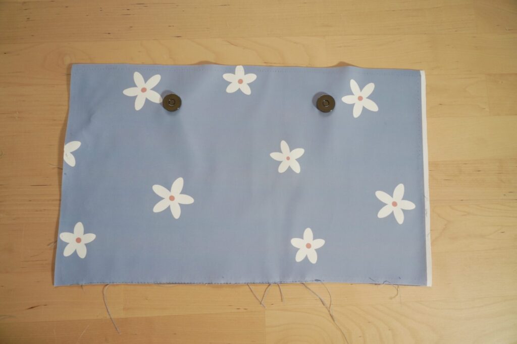 Munissez-vous d’un rabat. Puis à 4cm du bord inférieur, et à 9cm des côtés, thermocollez sur l’envers vos 2 Wonder dots et placez vos fermoirs aimantés (partie mâle).