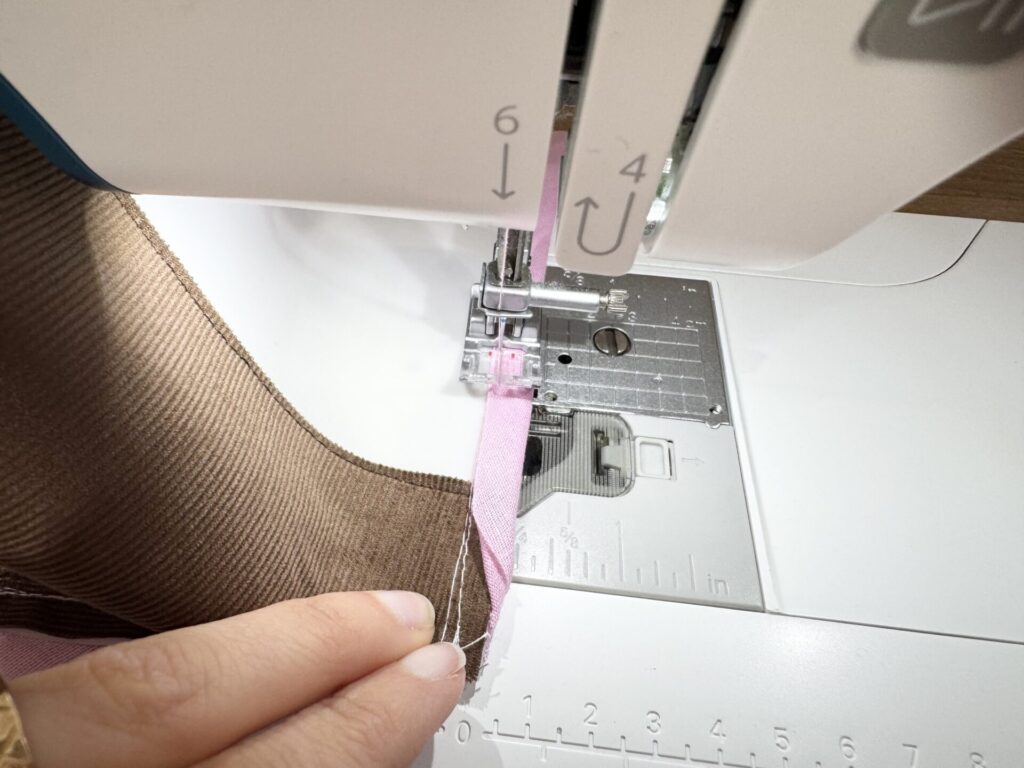 Arrêtez-vous 1cm avant l’angle. Plantez l’aiguille dans le tissu + biais.